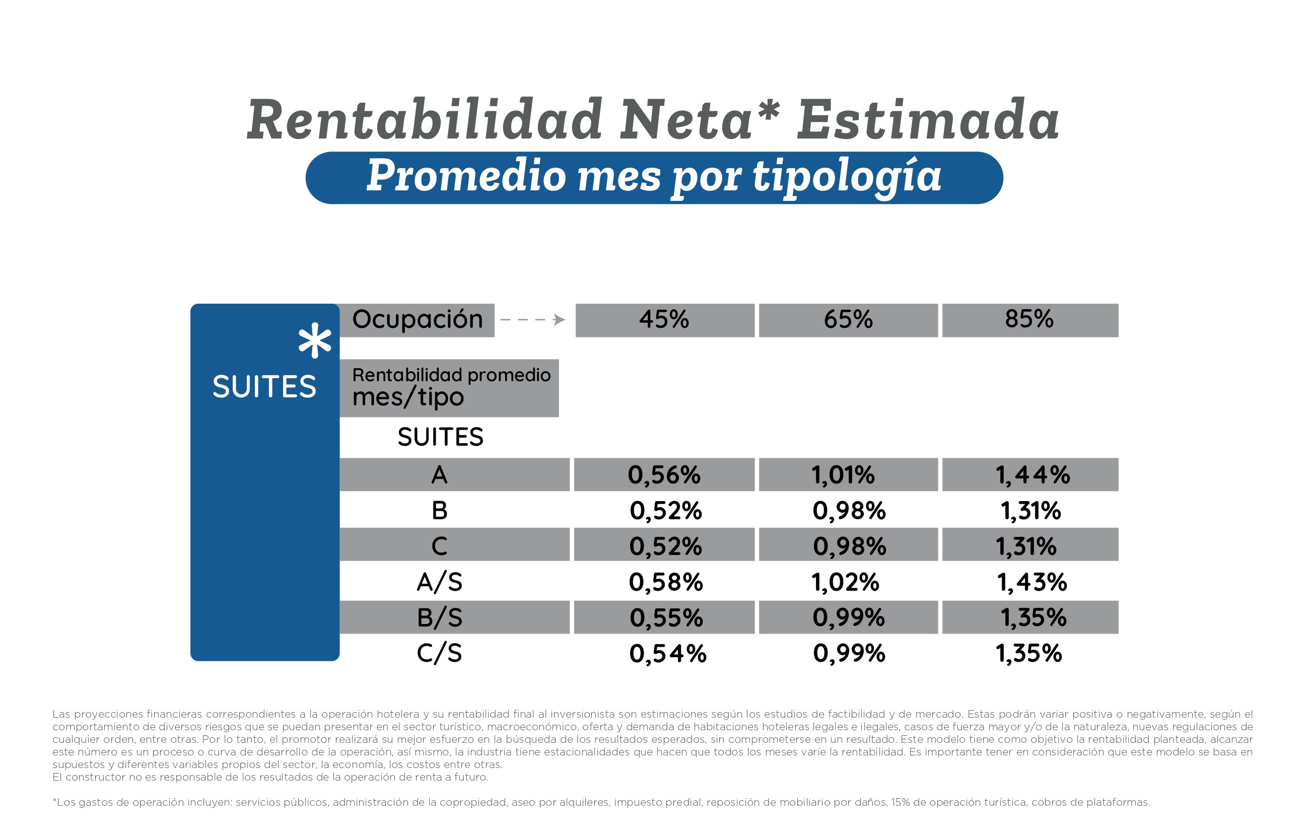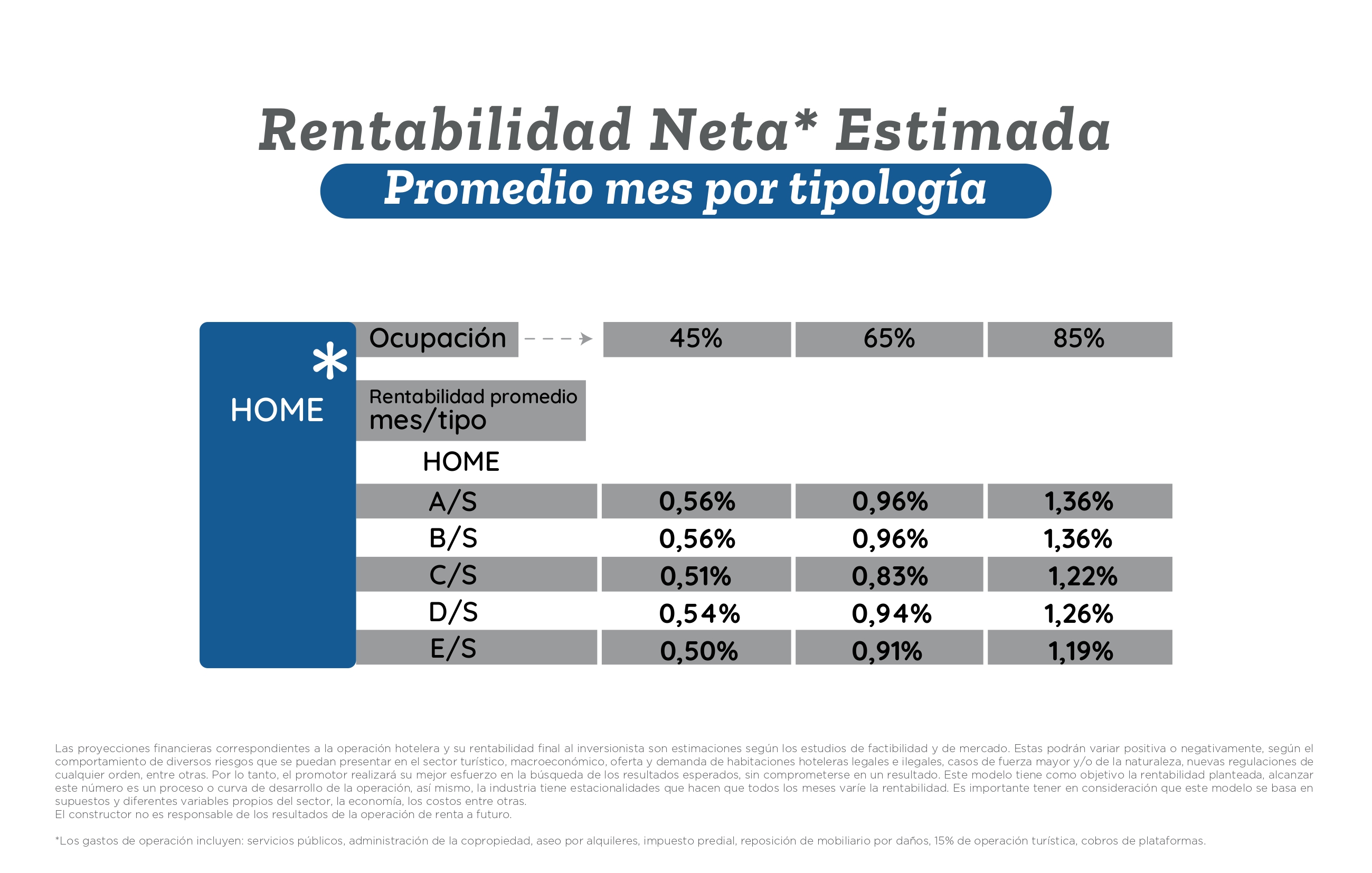 En la siguiente tabla se observa un ejercicio de rentabilidad estimada de acuerdo a las estadísticas del destino, manejando un rango de ocupación entre el 50% y 90%; reflejando el increíble negocio que puede ser invertir en Sunno Blue Homes y entrar en el negocio de las rentas de corta estadía.